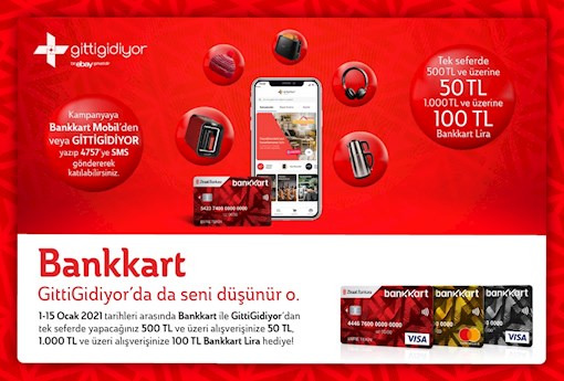 - Bankkart'ın kredi kartı veya banka kartı özelliği ile gittigidiyor.com 'dan tek seferde yapılacak 500 TL- 1.000 TL arası alışverişlere 50 TL , 1.000 TL ve üzeri alışverişlere 100 TL Bankkart Lira kazanımı sağlanacaktır.
