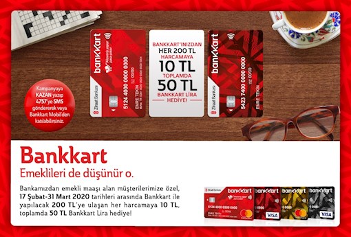Emekli Maaşını Bankamızdan Alan Müşterilerimize Özel, Bankkart ile toplamda 200 TL'ye ulaşan her harcamaya 10 TL, toplam 50 TL Bankkart Lira!