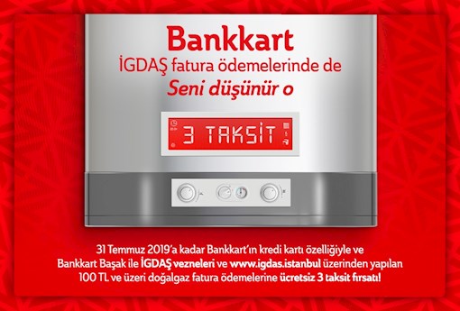Bankkart'ın ve Bankkart Başak'ın kredi kartı uygulaması ile 31 Temmuz 2019'a kadar İGDAŞ vezneleri ve http://www.igdas.istanbul/ üzerinden yapacağınız fatura ödemelerine ücretsiz 3 taksit fırsatı!