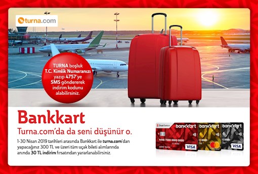 Bankkart sahiplerinin 1 Nisan-30 Nisan2019 tarihleri arasında Turna.com'dan yapacakları tek yön veya gidiş-dönüş uçak biletlerinde 300 TL ve üzeri uçak bileti alımlarında anında 30 TL indirim fırsatı!